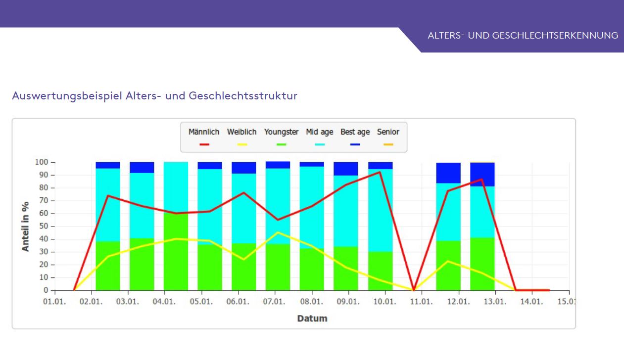 Das System erfasst das Alter und Geschlecht sowie die Anzahl und Betrachtungsdauer von Personen vor verschiedenen Werbeaktionen, wie z.B. digitale Displays, Plakate oder auch Regale. Die Auswertung der verschiedenen erhobenen Daten ermöglicht den Nutzern eine exakte Werbeerfolgskontrolle durchführen zu können. Zudem besteht die Möglichkeit, die anzuzeigende Werbebotschaft in Echtzeit an das Geschlecht oder die Altersgruppe des Betrachters anpassen zu können. Ihre Vorteile · Analyse der Käuferstruktur nach Alter und Geschlecht · Bessere Anpassung der Marketingaktivitäten an die Zielgruppen · Potenzielle Steigerung der Werbewirksamkeit · Aktionen aufgrund von Erkennung ausführen, z.B. zielgruppengerechte Werbung auf Bildschirm anzeigen · Analyse der Daten in Crosscan Connect · 100% datenschutzkonform, keine Speicherung personenbezogener Daten